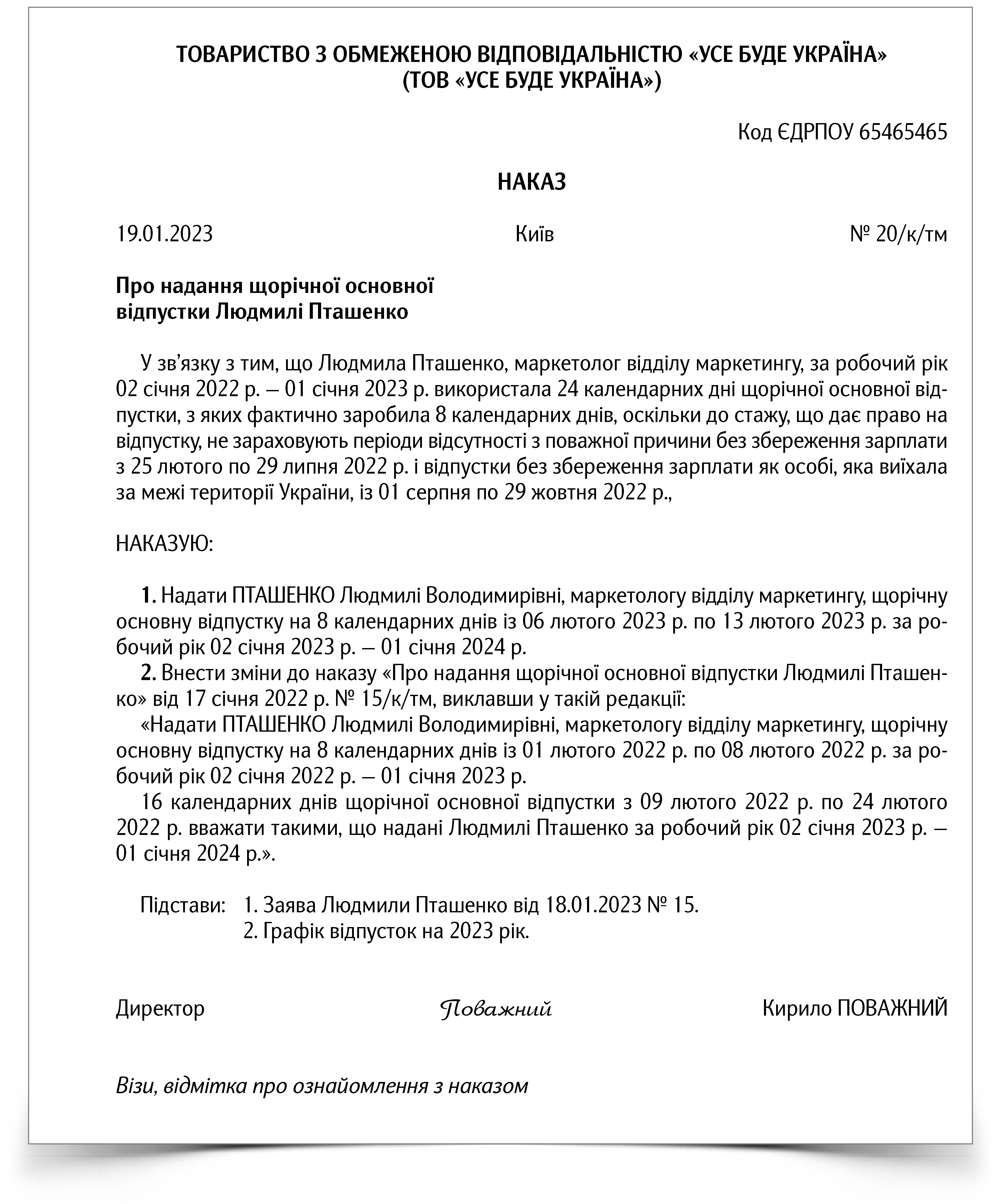 Зразок наказу про щорічну основну відпустку працівнику, який за попередній робочий рік використав більше днів, ніж заробив
