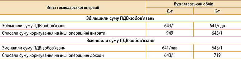 Щоб показати в обліку розподіл та річний перерахунок ПДВ, доцільно відкрити транзитний аналітичний субрахунок 643/1 «Податкові зобов’язання, що підлягають коригуванню» (табл.).